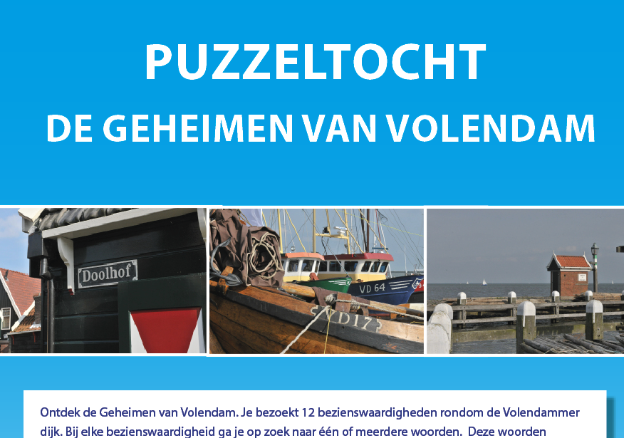 Beleef Volendam op een unieke en verrassende manier met puzzeltocht 'De Geheimen van Volendam'. Tijdens deze tocht ontdek je 12 bijzondere bezienswaardigheden rondom de Volendammer dijk. Zo bezoek je onder andere de authentieke visafslag, het beroemde Hotel Spaander, de unieke Stolphoevekerk en de pittoreske vissershuisjes in het Doolhof.